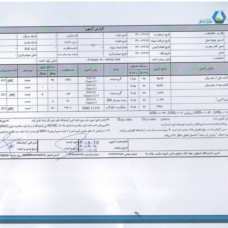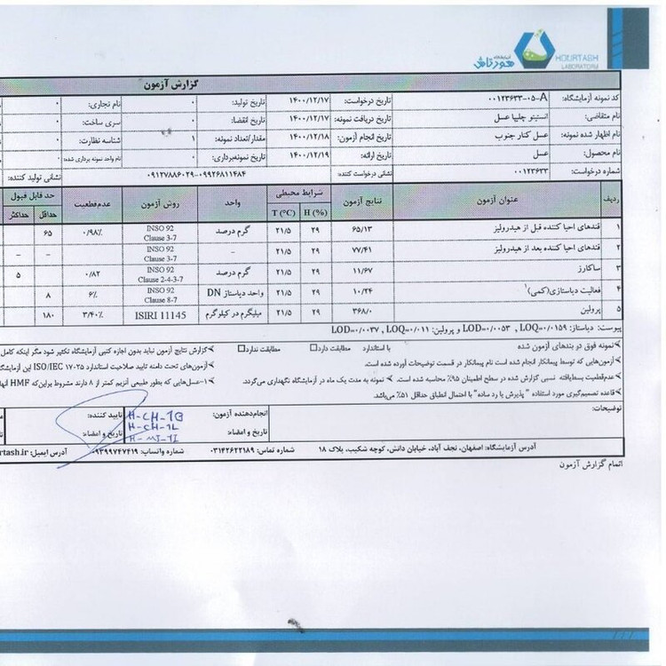 عسل کنار اعلا عسل خام خوش طعم و ناب 👌🏻 پرولین ۳۶۸ فعالیت دیاستازی ۱۰/۲۴ 📈🔬🧬آزمایشگاه هورتاش معتبرترین آزمایشگاه تخصصی کشور است. 👌🏻حدود ۹۰ درصد تغذیه زنبورها در این عسل از گل گیاهان و بیشتر گل کنار تغذیه کردن و مابقی از شربت زنبورداری. 👈🏻 رنگ عسل در هر سری برداشت کمی متفاوت است که طبیعی هست. ساکاروز کنار اصل به طور طبیعی بالاتر از دیگر گیاهان است. به طوری که ساکاروز عسل کنار خالص طبیعی تازه برداشت حتی به ۱۱ می رسد و البته به مرور زمان ساکاروزش کمتر می شود. پرولین عسل کنار خالص به ندرت به ۵۰۰ می رسد و کمتر از این مقدار است. این موضوع را متخصصان و تولیدکنندگان حرفه ای عسل کاملا مطلع هستند. عسل کنار از مرغوب ترین و عام پیندترین عسل هاست. وزن عسل با ظرف حدود 1010 گرم است. 🧪🧫⚗️🔬 اجماع زنبورداران و افرادی که تخصصی در زمینه عسل کار می کنند می دانند آزمایشگاه هورتاش نجف آباد اصفهان معتبرترین آزمایشگاه عسل ایران است چون باتجربه ترین آزمایشگرها و پیشترفتهترین تجهیزات را دارد و شهر نجف آباد به عنوان مهمترین و تخصصیترین بازار عسل ایران مطرح هست و لذا آزمایش گران و متخصصان این آزمایشگاه مدام نمونههای متعددی را آزمایش می کنند و بیشترین تجربه و دقیق ترین نتایج را می توانند بدست آورند؛ به طوری که هیچ آزمایشگاهی چنین اعتباری را نتوانسته در ایران داشته باشد. موسسه پژوهشی طبی بازرگانی سیمرغ برای انتخاب عسل هایش ابتدا افراد زنبوردار صادق و معتبر را ترجیحا از آشنایان انتخاب میکند و سپس در موقعیت های مختلف رفتار و عملکرد افراد را محک می زند و همچنین نمونه عسل ها را به آزمایشگاه هورتاش می فرستد و در صورت نیاز مجدد نمونه ها را برای تکرار آزمایش مجدد به همین آزمایشگاه می دهد چون ما دغدغه عرضه بهترین محصولات برای مشتریان و همراهان ارجمندمان داریم و خودمان هم از محصولات فروشگاهمان مصرف می کنیم. 👌🏻 عسل دار_ارو هست، وقتی با مقدار هم وزن آب مخلوط و جوشانده شود و کف آن گرفته شود تا بعد از جوشش به وزن اول عسل برسد، به غذا تبدیل می شود. این غذا را با خیال راحت می توانید مصرف کنید. البته عسل کنار به طور طبیعی کف زیادی دارد. 💥توصیه ما خوردن یک انگشت از چنین عسل مرغوبی اول صبح ناشتا هست، به جای زیاد عسل خوردن، عسل مرغوب خوردن به مقدار کم، توصیه عمومی هست. دار_ارو را باید کم بخوریم تا از مزیت آن نفع ببریم. مصرف زیاد عسل باعث افزایش خلط صفرا و گرم و خشک شدن بدن می شود مگر آن که به روش بالا جوشانده شود و کفش گرفته شود که به آن عسل مصفی یعنی کف گرفته و صاف شده می گویند و به عنوان غذا مصرف می شود و حرارت (صفرا) را بالا نمی برد. در سکنجبین یا سرکه انگبین هم باید از عسل کف گرفته استفاده کرد. 😊 راستی تا حالا فروشگاهی دیدین که در مورد محصولات واقعیت رو کامل و پوست کنده در اختیار مشتری بگذاره؛ برای #مؤسسه_پژوهشی_طبی_بازرگانی_سیمرغ سلامتی و نفع مردم مهمتر از فروش بی برکت؛ به راستی که برکت در صداقته.