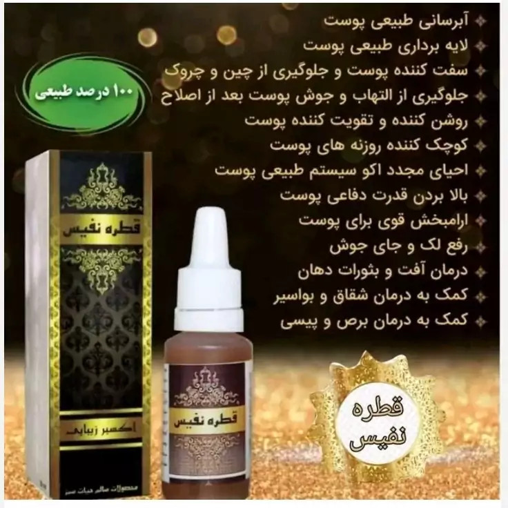 قطره نفیس اصل طبق مبانی طب سنتی کاملا طبیعی ترکیبات: عسل، سرکه اسلامی مخصوص ، روغن های طبیعی مورد تایید طب اسلامی و ... خواص: ✅ کمک به رفع کبودی زیر چشم ✅ کمک به رفع گودی زیر چشم ✅ کمک به ازبین برندن لک و جای جوش ✅ ازبین برنده چین و چروک ✅ آبرسان و لطیف کننده ✅ روشن کننده ✅ جوان کننده ✅ صاف کننده 💢دستور مصرف این محصول کاملا طبیعی و خوراکی می باشد یعنی به طور خوراکی مورد استفاده است. به عنوان مثال برای جوش و بثورات دهان و زبان، آبسه دندان و … نیز فوق العاده مفید است. برای از بین بردن کبودی زیر چشم اگر وارد چشم بشود بسیار برای چشم مفید است و خطری متوجه چشم نیست ضمن اینکه برای بینایی مفید است چربی های اضافی چشم را نیز از بین می برد البته مقداری سوزش دارد که این امر طبیعی است. با توجه به تست هایی که انجام شده ممکن است برای برخی از افراد حساسیت پوستی ایجاد کند، پیشنهاد ما این است که ابتدا به صورت مدت زمان خیلی کوتاه در حد چند دقیقه استفاده کنید اگر مشکل پوستی نداشتید (مثلا قرمزی و خارش) پنج دقیقه را به ده دقیقه، یک ربع، نیم ساعت، یک ساعت، و دو ساعت افزایش بدهند و یا شب تا صبح بهترین زمان استفاده از قطره ی نفیس، سحر موقع نماز شب یا نماز صبح می باشد و صورت اگر خیس باشد خیلی بهتر است ولی به صورت خشک هم می شود استفاده کرد. اگر برای از بین بردن چین و چروک استفاده می کنید، به صورت دورانی، خیلی آرام باید به پوست مالیده شود. برای جوش ها کافی است فقط مقدار بسیار کمی از این قطره را روی انگشت بگذارید و به آرامی روی محل جوش یا آکنه ضماد کنید. 🔺نکته مهم: حتما قبل از استفاده بر روی صورت مقداری از آن را به بازوی خود بزنید تا حساسیت نداشته باشید. این محصول خراب نمی شود